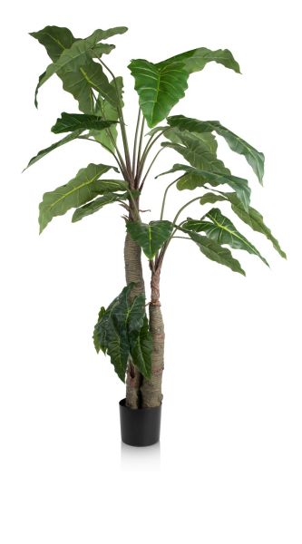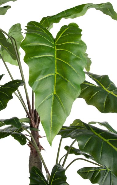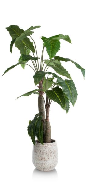 La plante Alocasia est également appelée Taro, Reuzentaro ou oreille d'éléphant. Ce dernier nom est lié à la forme de ses énormes feuilles. À l'origine, cette plante pousse dans les régions tropicales et a pour avantage d'avoir des feuilles assez grandes pour s'abriter en-dessous en cas d'averse tropicale. Fort heureusement, cela ne risque pas d'arriver à l'intérieur, l'Alocasia peut dès lors simplement devenir une belle plante décorative de 180 cm. De plus, aucun risque que cette plante artificielle de COCO maison ne continue à grandir ! Dimensions du pot : diamètre 21 cm / hauteur 17 cm.