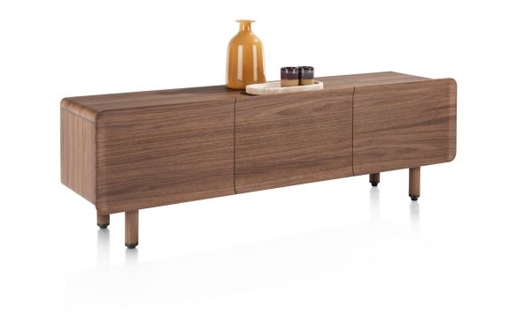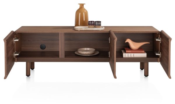 Le lowboard BRIANZA est une solution stylée si vous recherchez un meuble TV ou hi-fi moderne et compact. Le meuble possède trois portes sans poignées avec un système soft-close et est fabriqué en noyer plaqué laqué. Ses nervures visibles forment un ensemble fluide sur toute la largeur du meuble, ce qui lui confère un aspect luxueux. Les coins arrondis du corps du meuble et du plateau supérieur se rejoignent harmonieusement sur les pieds arrondis en noyer plaqué. Ses faces avant sont spéciales grâce à un bord subtilement incurvé qui forme un élégant cadre arrondi. Placez BRIANZA au sol ou optez pour un montage mural et créez un effet aérien dans votre intérieur.