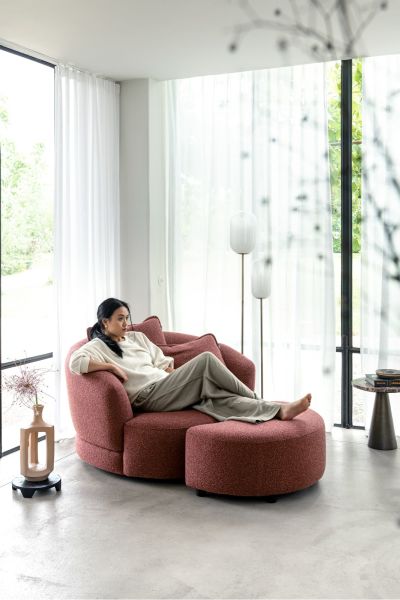 Faites la connaissance de CERVOS, un fauteuil pivotant rond qui apportera de la douceur à votre intérieur. Avec ses 130 cm de diamètre et ses deux coussins inclus (60x60 et 45x45 cm), CERVOS est une invitation à la détente. Le dossier et les accoudoirs se fondent l'un dans l'autre en une forme douce et arrondie, pour un look organique. Sa profondeur d'assise vous permet une relaxation ultime et ses pieds bas sont subtilement dissimulés. Comme le fauteuil CERVOS est recouvert de tissu de tous les côtés, vous pouvez le placer facilement au milieu de l'espace. Choisissez votre revêtement favori parmi notre sélection. Vous préférez quelque chose de plus compact ? Il existe dans une version plus petite avec un pouf assorti. Quel modèle choisirez-vous ?