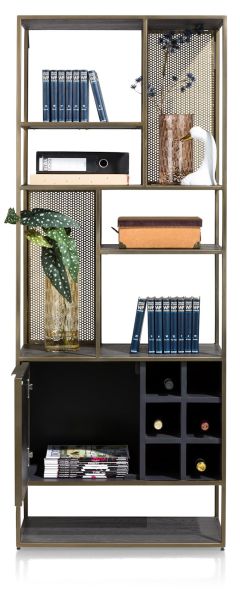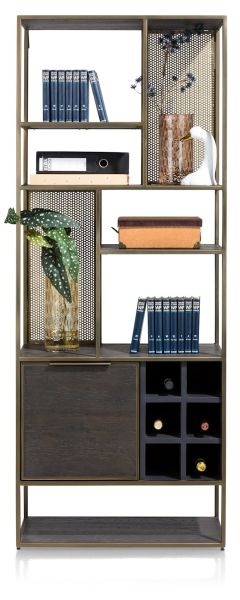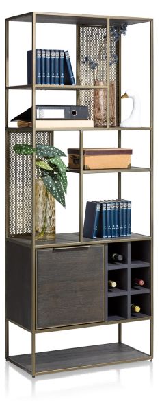 Cette bibliothèque industrielle moderne de la collection City est un véritable accroche-regard à l'intérieur. La bibliothèque est faite de placage de chêne de couleur Castle Anthracite en combinaison avec du métal de couleur or. Le jeu de lignes de cette bibliothèque, composée d'une porte, de 6 niches et de 6 casiers à vin, est vraiment saisissant. La bibliothèque est également disponible dans la couleur Railway Brown avec du métal noir.