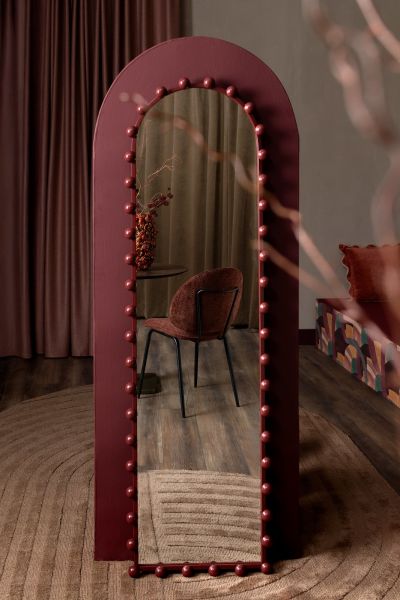 Imaginez-vous en superstar avec ce magnifique miroir en pied Donny de style hollywoodien de COCOmaison ! Son cadre bordeaux à pois rappelle immédiatement le dressing d'une star de cinéma et apporte instantanément une touche de glamour à votre intérieur. Il mesure 50 x 170 cm, vous permettant ainsi de vous admirer de la tête aux pieds. La couleur rouge chaud est très tendance et s'intègre parfaitement dans un style d'intérieur chic et hôtelier. Un miroir aussi grand est non seulement beau, mais aussi pratique. Il crée une illusion d'espace dans une pièce plus petite et, si vous le placez en face d'une fenêtre, il reflète la lumière entrante, rendant immédiatement plus lumineuse une pièce ou un couloir.