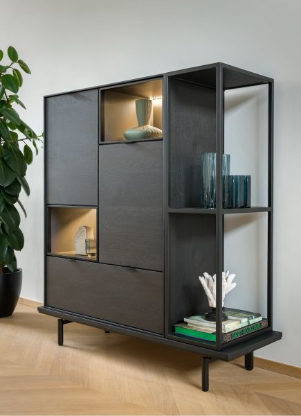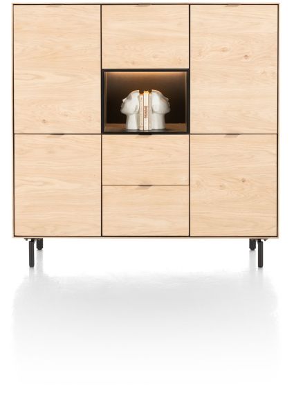 La dressette ELEMENTS est un meuble polyvalent qui se situe entre un highboard et un buffet. Cet accroche-regard contemporain arbore une apparence raffinée. L'extérieur respire le luxe avec son chêne plaqué de couleur naturelle tandis que l'intérieur du meuble est en mélaminé anthracite. Avec ses 5 portes, ses 2 tiroirs et sa niche dotée d'un éclairage LED, cette dressette offre assez d'espace de rangement. ELEMENTS mesure 150 cm de large et se décline également en couleur onyx. Les pieds en métal lui confèrent une touche finale robuste. Découvrez également les autres armoires de la série ELEMENTS.