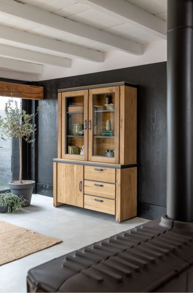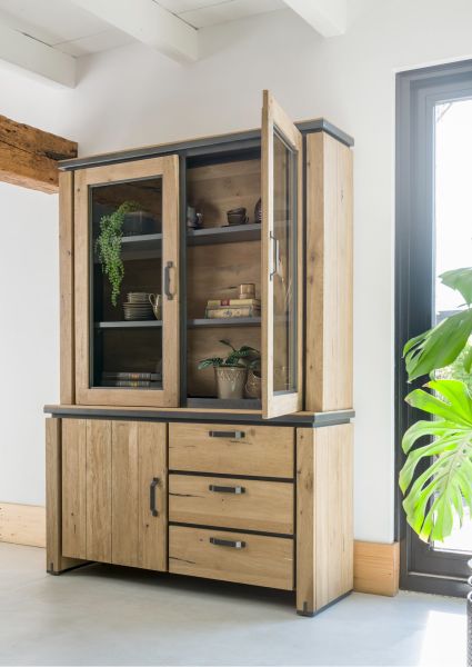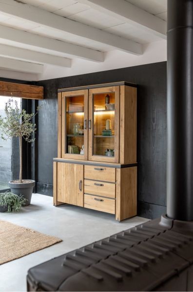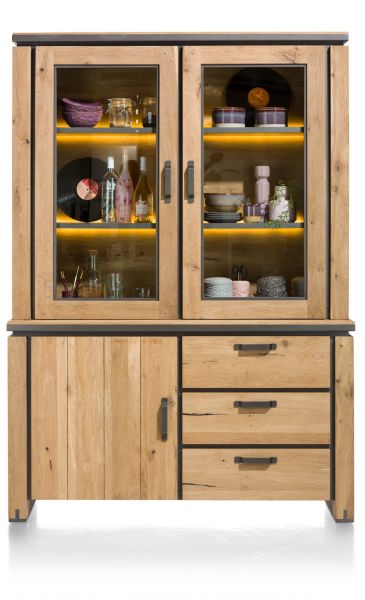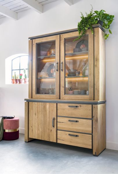 Farmland, vaisselier 150 cm - 1-porte + 2-portes de verres + 3-tiroirs +LED