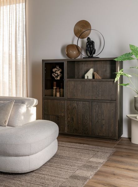 Gijon, highboard 145 cm - 1-porte de verre + 2-portes + 2-tiroirs + 1-p. rabattante + 1-niche (+LED)