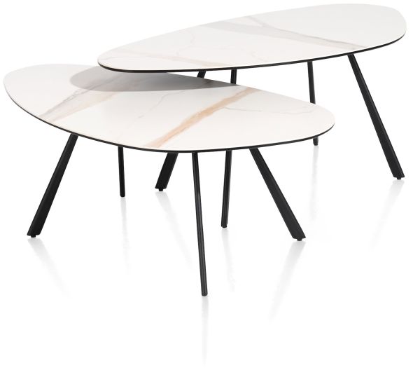 Envie d'une table basse élégante de forme organique ? La table basse MONTELLO est exactement ce qu'il vous faut. MONTELLO possède un plateau blanc marbré en céramique sur verre et repose sur un magnifique piètement en métal noir. Cette table est également disponible en noir et dans une taille un peu plus grande. Vous pouvez ainsi combiner MONTELLO et former un set du plus bel effet dans notre séjour.