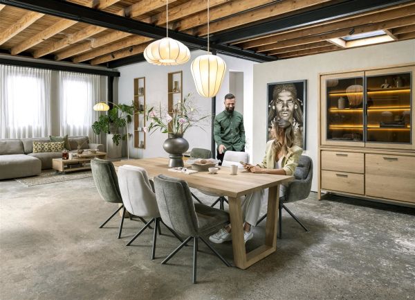 Nyborg, table 230 x 100 cm - plateau avec bords effet tronc d'abre - pied bois en V